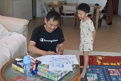息子がエンゾーくらいの年齢のとき、やはり、同じような「お絵描き遊び」をやった。彼のリクエストはいつも「サンダーバード」だった。僕は、「サンダーバード一号」から「五号」まで、さっと描けるように研究していた。今、「落書きシリーズ」という連作の絵を描いているが、元々は、自分の子供たちに描いていたスタイルの絵を、発展させたものである。